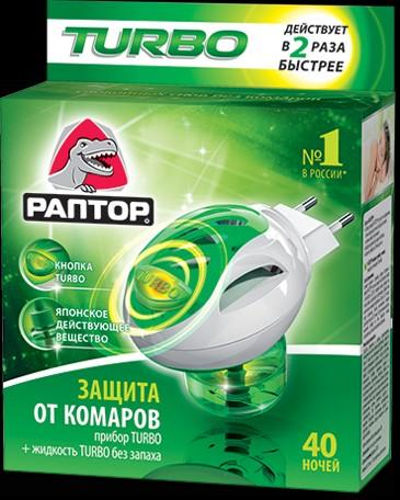 Прибор РАПТОР® представляет собой работающий от обычной сети 220 В миниатюрный прибор. В фумигатор вставляются сменные картонные пластины или баллончик с жидкостью. Термоэлемент фумигатора РАПТОР® нагревает стержень флакона с жидкостью или пластину, тем самым заставляя действующее вещество испаряться. При включении кнопки TURBO температура на керамическом элементе становится выше, что приводит к более интенсивному испарению вещества из флакончика. Таким образом, требуемая концентрация действующего вещества в комнате достигается в 2 раза быстрее, чем при использовании обычного режима.