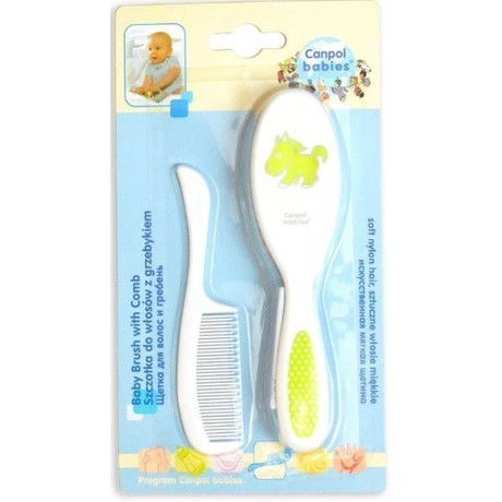 Щетка нейлоновая с расческой мягкая Щетка нейлоновая выполнена из полностью безопасных материалов. Щетина выполнена из искусственного материала, нежно массирует голову малыша, не электризует волосы и отлично подходит для счесывания себорейных корочек. Округлая форма щетки безопасна в использовании, а яркие цвета порадуют малыша. В комплект входит гребешок. Особенности: гребень в комплекте безопасная округлая форма CANPOL BABIES Щетка нейлоновая с расческой мягкая, цвет: зеленый Набор состоит из расчески с закругленными зубчиками и щетки для волос с мягкой щетиной. Изделия галантерейные детские из пластмасс для детей до 3-х лет.