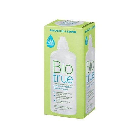 Раствор Biotrue - универсальный раствор для контактных линз, который имеет доказанную биосовместимость и обеспечивает 20 часов увлажнения линз за счет естественного полимера - гиалуронана. Универсальный раствор Biotrue - кондиционирует, очищает, удаляет протеиновые отложения, дезинфицирует, промывает, сохраняет комфорт и легкость при ношении линз.