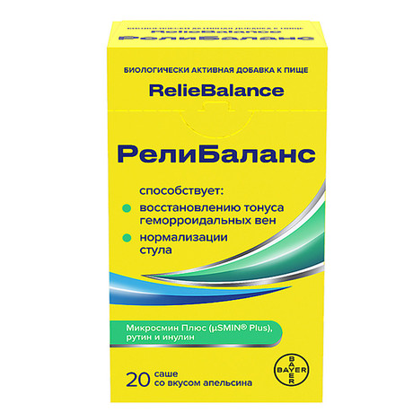 Биологически активная добавка (БАД) к пище РелиБаланс (RelieBalance) − это комбинация диосмина (буферизованного диосмина Микросмин Плюс (µSMIN® Plus, товарного знака компании «Джиеллепи С.п.А.», Италия) и инулина (пребиотика), усиленная рутином (флавоноидом), которая способствует улучшению кровообращения, нормализации микрофлоры кишечника, а также улучшению регулярности и консистенции стула (смягчению). Эффекты обусловлены комплексным действием компонентов, которые способствуют: