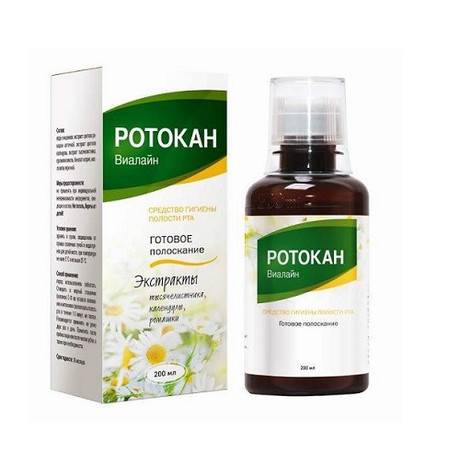 РОТОКАН ВИАЛАЙН ГОТОВОЕ ПОЛОСКАНИЕ. Органолептика (консистенция, цвет, запах): Однородная жидкость без посторонних включений, цвет коричневый, с характерным запахом используемого сырья. Готовое полоскание Ротокан Виалайн не содержит спирта, поэтому не оказывает раздражающего действия на слизистую оболочку полости рта и не вызывает ощущения сухости во рту. Экстракт ромашки аптечной. Оказывает противовоспалительное, кровоостанавливающее, антисептическое, слабое вяжущее, болеутоляющее, седативное действие. Экстракт цветков календулы. Обладает бактерицидными свойствами в отношении ряда возбудителей, особенно стафилококков и стрептококков, которые провоцируют нарушения в тканях слизистой; оказывает ранозаживляющее и противовоспалительное действие.