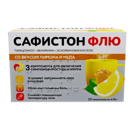 | Сафистон Флю | Порошок д/пригот. р-ра д/приема внутрь (со вкусом лимона) 500 мг+25 мг+200 мг: пак. 4.95 г 1, 2, 3, 4, 5, 6, 7, 8, 9, 10, 12, 15, 16, 20, 24 или 30 шт. рег. №: ЛП-006790 от 18.02.21 *- Действующее* Дата переоформления: 17.01.23 | |