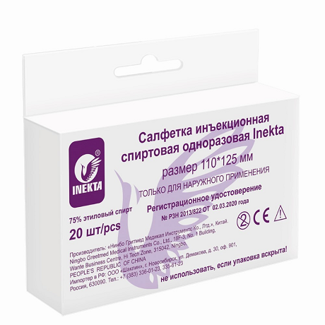 Бренд INEKTA Страна производителя Китай Салфетка инъекционная спиртовая одноразовая Inekta 110х125 мм предназначена для дезинфекции кожи. Изделие однократного применения нестерильное. Размер салфетки 110х125 мм