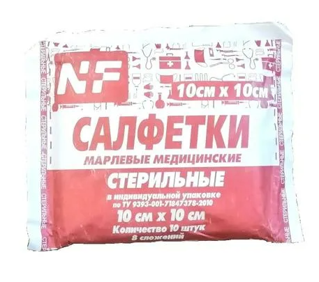 Стерильные салфетки: размер 10 см х 10 см (в сложенном виде), плотность марли 36 г/м2, 8 сложений, в упаковке 10 шт.