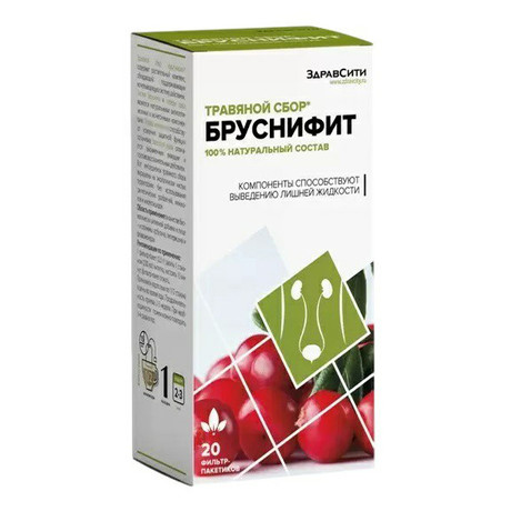Травяной сбор «Бруснифит» содержит растительный комплекс, обладающий поддерживающим мочевыводящую систему действием. Листья брусники и череда имеют антисептический, мочегонный и желчегонный эффекты. Плоды шиповника способствуют усилению защитных функций организма. Зверобой отличается выраженными вяжущими и противовоспалительными свойствами. Ингредиенты сбора «Бруснифит» выращены на экологически чистых территориях методом органического земледелия (без использования синтетических удобрений, химикатов и инсектицидов). Соответствие международным стандартам подтверждает 100 % натуральность состава. Без искусственных ароматизаторов, красителей и ГМО. Не содержит сахара и кофеина.