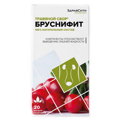 Травяной сбор «Бруснифит» содержит растительный комплекс, обладающий поддерживающим мочевыводящую систему действием. Листья брусники и череда имеют антисептический, мочегонный и желчегонный эффекты. Плоды шиповника способствуют усилению защитных функций организма. Зверобой отличается выраженными вяжущими и противовоспалительными свойствами. Ингредиенты сбора «Бруснифит» выращены на экологически чистых территориях методом органического земледелия (без использования синтетических удобрений, химикатов и инсектицидов). Соответствие международным стандартам подтверждает 100 % натуральность состава. Без искусственных ароматизаторов, красителей и ГМО. Не содержит сахара и кофеина.