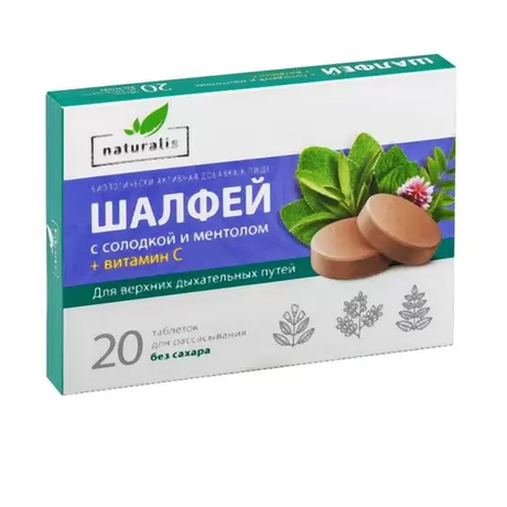 Naturalis Шалфей таблетки для рассасывания, без сахара с солодкой ментолом витамином С, 20 шт.