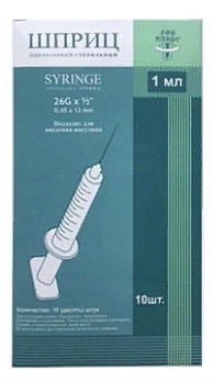 Шприц инъекционный 1 мл (U100). Стерильный. Одноразовый трехкомпонентный. Игла 26Gх1/2 (0.45Х12) - съемная, надетая на шприц.