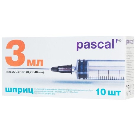 Шприц инъекционный 3-х компонентный однократного применения стерильный ТМ PASCAL'. Цилиндр полностью прозрачный для хорошей визуализации содержимого. Шкала хорошо читаемая напечатана УФ чернилами, что обеспечивает устойчивость к смыванию и истиранию при использовании. Расположена строго параллельно вертикальной оси цилиндра. Манжета не содержит латекс для предотвращения аллергических реакций. Защитный колпачок иглы имеет пять ребер жесткости, которые обеспечивают удобство и дополнительную безопасность при снятии колпачка с иглы. Игла инъекционная со стандартным срезом, с трехгранной заточкой и силиконовым покрытием для атравматического введения и снижения болезненности при проникновении в ткани. Шприц упакован в индивидуальную блистерную упаковку с отогнутым краем, которая вскрывается с небольшим усилием, что предотвращает самопроизвольное вскрытие, и без образования бумажной бахромы.