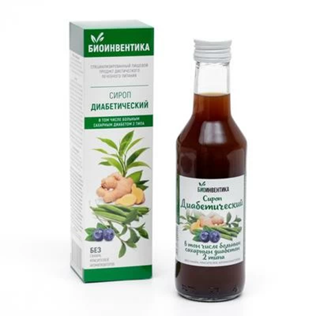 «Сироп диабетический» - специализированный пищевой продукт диетического лечебного питания, в том числе больным сахарным диабетом 2 типа. Продукт разработан специалистами компании ООО «Биоинвентика» для больных диабетом 2 типа, профилактики диабета и использовании в комплексной терапии для лечения этого заболевания. «Сироп диабетический» - природный продукт на основе традиционно используемых для лечения СД экстрактов побегов черники, створок фасоли, горца птичьего, усилен введением в рецептуру корня имбиря и листьев зеленого чая, а также обогащен комплексом поливитаминов. «Сироп диабетический» прошел исследование по оценке эффективности в отделении болезней обмена веществ клиники ФГБУН «ФИЦ питания и биотехнологии». Результаты исследований свидетельствуют, что включение в состав «Сиропа диабетический» экстрактов побегов черники, створок фасоли, травы горца птичьего, корня имбиря и листьев зеленого чая, содержащих полифенолы и другие биологически активные соединения, обладающие гипогликемическими и антиоксидантными свойствами, позволяет корригировать хроническую гипергликемию и метаболические нарушения у пациентов СД 2 типа, способствуя снижению риска развития сосудистых осложнений при этом заболевании.