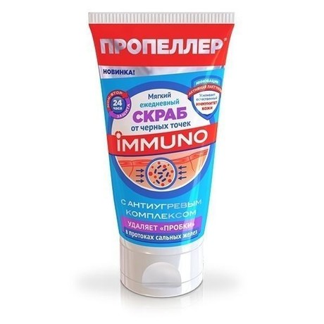 Мягкий ежедневный скраб от черных точек серии IMMUNO Пропеллер максимально эффективно прочищает закупоренные поры, вследствие чего снижается риск возникновения угрей и прыщей. В состав входят активные отшелушивающие частицы, которые глубоко очищают кожу. Скраб бережно удаляет омертвевшие частицы кожи и открывает закупоренные поры, благодаря чему кожа начинает «дышать». Скрабовые частицы имеют пористую основу, которая полностью впитывает все загрязнения из пор. Гель-скраб обладает оздоравливающим эффектом, а также противовоспалительным действием.