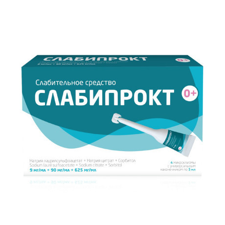 | Без рецепта | Слабипрокт | Раствор ректальный 9 мг+90 мг+625 мг/1 мл: микроклизмы 5 мл 4 или 12 шт. рег. №: ЛП-(003694)-(РГ-RU) от 15.11.23 *- Действующее* |