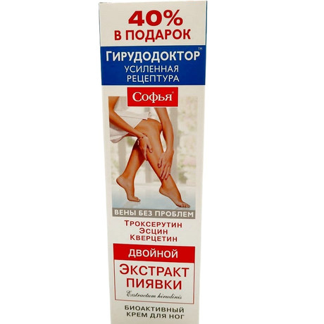Софья Двойной экстракт пиявки с троксерутином, эсцином и кверцетином - натуральное эффективное средство, которому доверяют миллионы женщин во всем мире. Крем Софья обеспечивает комплексное воздействие и оказывает действенную помощь в поддержании красоты и здоровья ног, нормализует микроциркуляцию и лим-фоотток; снижает ломкость капилляров и риск возникновения трофических изменений кожи, улучшает эстетический вид ног. Экстракт медицинской пиявки (пия-вит) - по праву считается одним из лучших средств при лечении варикозной болезни ног. Он содержит около 100 биологически активных веществ, которые оказывают мощное положительное воздействие на кровеносные сосуды. Ферменты медицинской пиявки способствуют улучшению состава и уменьшению свертываемости крови (являются антикоагулянтами прямого быстрого действия), укреплению и вос-станавлению внутренней поверхности проблемных вен. Рецептура и технология производства крема разработана группой ученых под руководством доктора биологических наук, профессора, лауреата Государственной премии Б.Н. Орлова. Эффективность крема подтверждена обширной многолетней практикой применения в России и за рубежом.