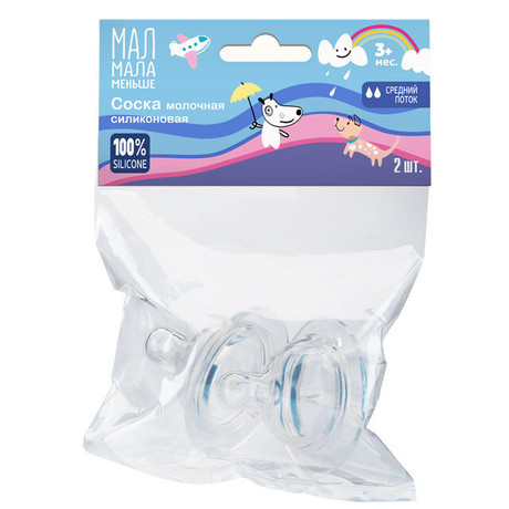 Соски предназначены для детей от 3 месяцев. Соски со средним потоком подходят для негустых жидкостей: чая, воды, соков без мякоти. Изготовлены из 100 % силикона, не содержат бисфенол А. Соски используются вместе с бутылочками Мал Мала Меньше.