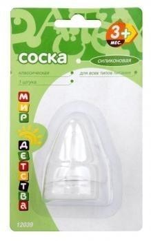Другие формы «Соска МИР ДЕТСТВА»Силиконовая соска Мир детства имеет классическую форму. Подходит ко всем стандартным бутылочкам. Оптимальна для негустого питания: молока и молочных смесей, чая, воды. Предназначена для детей с 3-х месяцев.