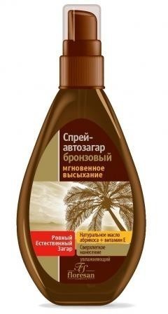 Другие формы «Спрей Флоресан Пальмовый рай»Практичный и удобный в использовании спрей-автозагар можно использовать круглый год для получения красивого равномерного загара. Масло абрикоса и витамин Е, входящие в состав спрея, тонизируют кожу, восстанавливают ее упругость и эластичность, препятствуют обезвоживанию эпидермиса. Может применяться для маскировки локальной депигментации кожи.