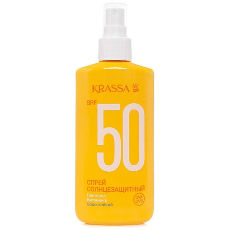 Спрей солнцезащитный KRASSA SPF 50 Внешний вид: Однородная эмульсия белого цвета с легким цветочным ароматом. Специальные особенности: БЕЗ СПИРТА. ВОДОСТОЙКИЙ. Спрей защищает кожу от негативного воздействия солнечных лучей, свободных радикалов, повышенной пигментации и фотостарения. Спрей легко наносится и быстро впитывается. Содержит фотостабильные UVA/UVB-фильтры органической и минеральной природы, Пантенол и Витамин Е. Максимальная степень защиты от УФ-лучей. Результат: Надежно защищает от воздействия УФ - лучей, предотвращая появление ожогов и предупреждая преждевременное старение кожи. Не оставляет белых следов, полностью впитывается.