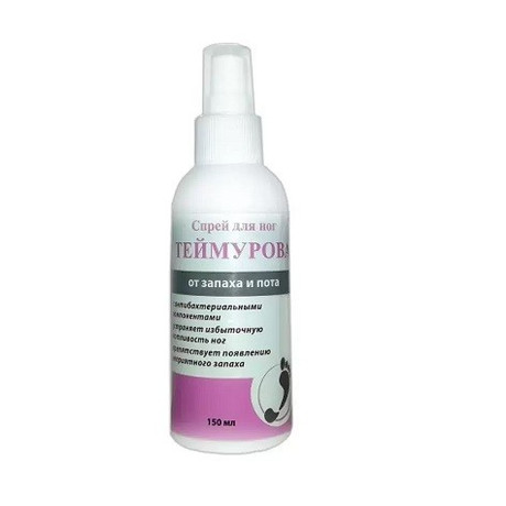 с антибактериальными компонентами; устраняет избыточную потливость ног; препятствует появлению неприятного запаха. Спрей рекомендован для ежедневного применения с целью устранения запаха и избыточной потливости ног, чему способствует комплекс активных компонентов: борная, салициловая кислоты, тетраборат натрия и метенамин. Эфирные масла чайного дерева, лаванды, мелиссы и салициловая кислота обладают антибактериальным действием, что способствует профилактике заражения грибком. Масло мяты перечной и ментол помогают снять усталость ног, охлаждают, дезодорируют и освежают кожу.