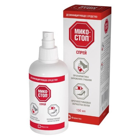 Средство дезинфицирующее МИКОСТОП® спрей предназначено для: • противогрибковой обработки обуви • обработки ступней ног с целью защиты от заражения грибком стопы и ногтей после контакта с потенциально зараженными предметами и поверхностями • дезинфекции перчаток при грибке ногтей на руках