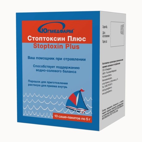 «Стоптоксин Плюс №10 саше-пакет по 5,0» («Stoptoxin Plus»)- Биологически активная добавка к пище для поддержания водно-солевого балланса Наша компания, Югмедфарм, рада предложить вам новый продукт от отравления-Стоптоксин Плюс 5г, порошки для приготовления раствора. Содержание в 5 г Калий 327,5 мг Натрий 515 мг