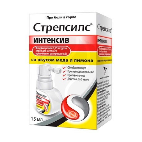 | Стрепсилс® Интенсив | Спрей д/местн. прим. дозированный 8.75 мг/доза: фл. 15 мл (15 доз) с дозир. устройством рег. №: ЛП-004767 от 29.03.18 *- Действующее* |
