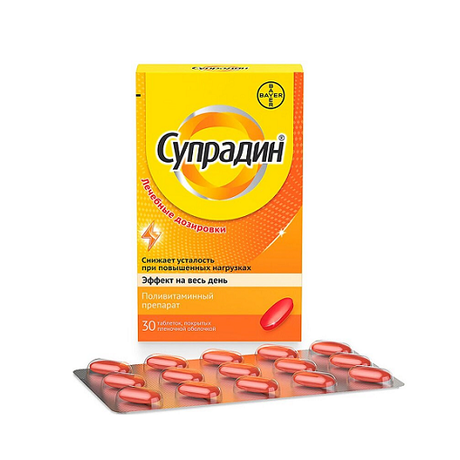 СУПРАДИН - поливитаминный комплекс, содержащий 12 важнейших витаминов, а также 8 минеральных веществ и микроэлементов. Состав препарата подобран так, чтобы удовлетворять суточную потребность организма в витаминах. Этот препарат быстро устраняет гиповитаминоз и восстанавливает энергетический баланс в организме. СУПРАДИН наиболее эффективно нормализует содержание витаминов С и В1 в сыворотке крови, а также тканевый обмен веществ у людей с гиповитаминозами различного происхождения. СУПРАДИН заряжает Вас энергией.