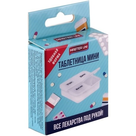 Таблетница содержит 4 отделения в соответствии с суточным режимом приема: утро, день, вечер, ночь.