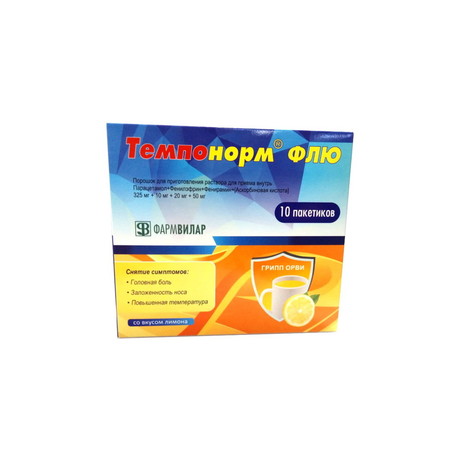 | Темпонорм® Флю | Порошок д/пригот. р-ра д/приема внутрь 325 мг+10 мг+20 мг+50 мг: 3, 5, 6, 10, 12 или 24 шт. рег. №: ЛП-007156 от 05.07.21 *- Действующее* |