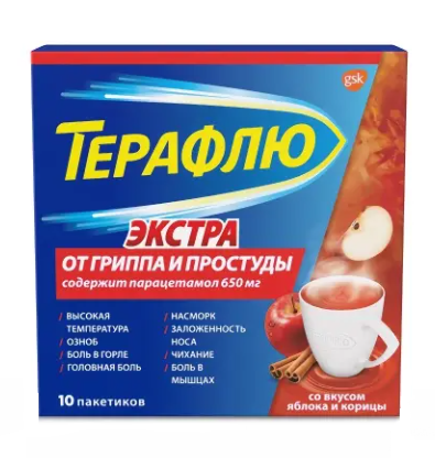 | Терафлю® от гриппа и простуды экстра | Порошок д/пригот. р-ра д/приема внутрь (яблочно-коричный) 650 мг+20 мг+10 мг/1 пак.: пак. 10 шт. рег. №: П N014315/01 от 23.03.09 *- Бессрочно* Дата перерегистрации: 16.09.16 |