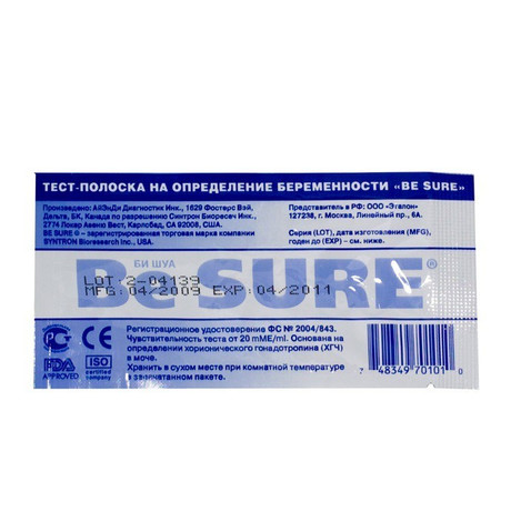 Тест-полоска Bee-Sure-S (БИ-ШУР-С) - предназначена для быстрого одностадийного качественного ин витро определения хорионического гонадотропина человека (ХГЧ) в моче методом иммунохроматографического анализа для ранней диагностики беременности.