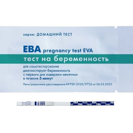 Бренд: ЕВА (EVA) Экспресс- тест для определения беременности. По своему устройству тест-полоски представляют собой пропитанную реагентом (с мечеными антителами к ХГЧ) полоску на пластиковой подложке. Высокая чувствительность 20 mME/ml. Достоверность свыше 99% с первого дня задержки. -По своему устройству тест-полоски самые простые и популярные. Они представляют собой пропитанную реагентом (с мечеными антителами к ХГЧ) полоску на пластиковой подложке. -ТЕСТЫ ЕВА (EVA) выявляют присутствие в моче «гормона беременности» - хорионического гонадотропина человека - ХГЧ, который начинает вырабатываться вскоре после оплодотворения. По мере увеличения срока количество этого гормона увеличивается. ТЕСТ EVA настолько чувствителен, что большинство женщин имеют достаточно «гормона беременности» для определения за 4 дня до ожидаемой менструации. - До проведения теста на раннем сроке рекомендуется использовать первую утреннюю мочу или сократить количество употребляемой жидкости. Вода разбавляет мочу и это может повлиять на выявление ХГЧ. Показания Ранняя диагностика беременности - Вы можете использовать тест ЕВА (EVA) на 5 дней раньше ожидаемого первого дня задержки менструации.