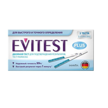 Бренд EVITEST (Эвитест) - линейка высокочувствительных тестов Evitest Plus - двойной тест для подтверждения результата. Экспресс-тест/тест-полоска на определение беременности. Evitest Plus - комплектуется двумя тест-полосками. Первая предназначена для определения основного результата, а вторая - для подтверждения первого через 48 часов, так как при беременности ХГЧ в моче увеличивается вдвое на каждые вторые сутки. EVITEST - Высокая чувствительность 20mME/мл позволяет диагностировать беременность уже в 1 день задержки менструального цикла или даже за 1-2 дня до ее предполагаемого начала.