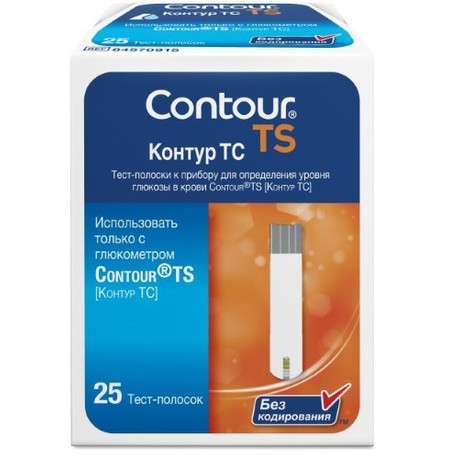 Тест-полоски КОНТУР ТС (Contour TS) предназначены к использованию только вместе с Глюкометром КОНТУР ТС (Contour TS) Тест - полоски Контур ТС предназначены для проведения самостоятельного измерения уровня глюкозы в цельной крови. Система Контур ТС имеет ряд особенностей, которые обеспечивают получение точного результата легко: -Точность системы соответствует требованиям нового международного стандарта ISO 15197:2013. -Для анализа требуется маленькая капля крови всего 0,6 мкл - ее будет достаточно для получения точного результата. Капиллярный забор крови - тест-полоска сама всасывает небольшое количество крови. -Система использует современный электрохимический метод измерения, который обеспечивает получение точных результатов без влияния уровня освещенности -Современный стабильный фермент - можно использовать тест-полоски в течение всего срока годности независимо от момента, когда упаковка тест - полосок была открыта -В системе используется технология "Без кодирования". Данная технология позволяют прибору каждый раз, когда вставляется тест-полоска, кодироваться автоматически, тем самым устраняется необходимость ручного ввода кода - частого источника ошибок. Таким образом предотвращаются ошибки, связанные с неправильным введением кода. Не нужно тратить время на ввод кода или кодового чипа/полоски; Тест позволяет провести количественное измерение уровня глюкозы в крови в диапазоне от 0,6 до 33,3 ммоль/л при помощи прибора Контур ТС. Технические характеристики системы КОНТУР ТС: I. Обеспечивающие высокую точность: 1. В тест-полоске используется современный фермент, который практически не имеет взаимодействия с лекарствами, что обеспечивает точные измерения при приеме, например, парацетамола, аскорбиновой кислоты 2. Глюкометр выполняет автоматическую коррекцию результатов измерений при гематокрите от 0 до 70% - это позволяет получать точные результаты при широком диапазоне гематокрита 3. Прибор обеспечивает надежность работы при следующих условиях: - диапазон температур 5°C - 45° - влажность 10 - 93% отн. влажности - высота над уровнем моря - до 3048 м. 4. Не требуется кодирования системы - код вручную вводить не нужно II. Удобство использования: 1. Маленький размер капли крови - всего 0,6 мкл, функция детекции «недозаполнения» 2. Система проводит измерение всего за 5 секунд, обеспечивая быстрое получение результатов 3. Память на 250 результатов - хранение данных для анализа результатов за 4 месяца 4. Автоматический расчет среднего показателя за 14 дней. 5. Капиллярный забор крови тест-полоской - тест-полоска сама всасывает небольшое количество крови. 6. Возможность взятия крови из альтернативных мест (ладонь, плечо) 7. Срок годности тест-полосок (указан на упаковке) не зависит от момента, когла упаковка тест-полосок была открыта , 8. Легко заметный оранжевый порт для тест-полосок 9. Большой экран (38 мм x 28 мм) 10. Автоматическая маркировка значений, полученных при измерениях, проведенных с контрольным раствором - эти значения также исключены из расчета средних показателей 11. Порт для переноса данных в PC 12. Широкий диапазон измерений 0.6 - 33.3 ммоль/л 13. Практически безболезненный прокол с регулируемой глубиной с помощью системы Микролет - Неглубокий прокол быстрее заживает. Минимальная травматизация при частых измерениях 14. Калибровка результатов по плазме крови 15. Б