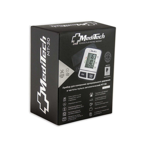 Бренд: MediTech Производитель: Medical Technology Products, Inc. США Страна происхождения: Китай Автоматический тонометр на плечо MediTech МТ-30 базовый, с адаптером, со стандартной манжетой 22-36 см и интеллектуальной системой измерения IQ system Габариты прибора, не более 140 х 90 х 48 мм Размеры торговой упаковки 160 х 125 х 85 мм Масса прибора (без элементов питания) 221 г Источник питания 4 элемента типа ААА Напряжение элементов питания 6В Срок жизни источника питания 2 месяца при трех измерениях в день Автоматический тонометр MediTech МТ-30 с адаптером в комплекте на плечо с интеллектуальной системой измерения IQ system предназначен для измерения систолического и диастолического давления и частоты пульса осциллометрическим способом. Прибор рекомендуется в качестве средства контроля артериального давления, частоты сердечных сокращений и для динамических наблюдений за этими параметрами в медицинских учреждениях и в домашних условиях. Особенности: • Технология интеллектуального измерения IQ system учитывает ЧСС (частоту сердечных сокращений) пользователя при измерении, определяет оптимальный уровень нагнетания манжеты для каждого человека, обеспечивая комфортное измерение и точный результат. Правильный уровень давления в манжете позволяет получить точный результат, избежать излишнего сжатия руки; • Память на 120 результатов измерений; • Цветная индикация давления по классификации ВОЗ позволяет оценить результат, определить нормальное давление и гипертонию 1, 2 и 3 степени; • Расчет среднего давления. В соответствии с рекомендациями ВОЗ для получения наиболее точного результата прибор рассчитывает среднее давление из 3 последних измерений; • Индикатор аритмии. Помогает выявить нарушения сердечного ритма на ранней стадии. При обнаружении аритмии на дисплее появляется специальный символ; • Большой жидкокристаллический дисплей; • В комплект входит стандартная манжета, на окружность руки 22-36 см.; • Возможность подключения манжет разного размера; • Индикация низкого уровня заряда источника питания; • Звуковая индикация начала и окончания измерения; • Сетевой адаптер в комплекте.