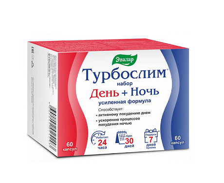 ТУРБОСЛИМ ДЕНЬ УСИЛЕННАЯ ФОРМУЛА: Рекомендуется в качестве биологически активной добавки к пище - источника кофеина, гидроксилимонной кислоты, йохимбина, дополнительного источника хрома. Усиленное действие. Способствует дневному жиросжиганию, контролю массы тела, активному похудению днем: усиленному сжиганию жиров, улучшению термогенеза, ускорению сжигания калорий, снижение аппетита в течение дня, ускорению метаболизма (обмена веществ), выработке дополнительной энергии. ТУРБОСЛИМ НОЧЬ УСИЛЕННАЯ ФОРМУЛА: Рекомендуется в качестве биологически активной добавки к пище - источника гидроксилимонной кислоты, хризофановой кислоты, с усиленным действием, для оптимизации обмена веществ. Способствует ускорению естественного процесса похудения ночью, усиленному сжиганию жиров, предотвращая их накопление, комфортному очищению организма, блокирует поступление лишнего сахара из пищи. Способствует контролю вечернего аппетита.