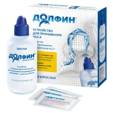 Устройство "DOLPHIN" в комплекте со средством на 30 процедур. Устройство рекомендовано для индивидуального пользования и применяется в целях профилактики гриппа, ОРЗ и ОРВИ, лечения ЛОР-заболеваний, гигиены носа (лицам, работающим на вредном производстве, спортсменам) путем промывания и орошения полости носа и носоглотки специальным раствором.