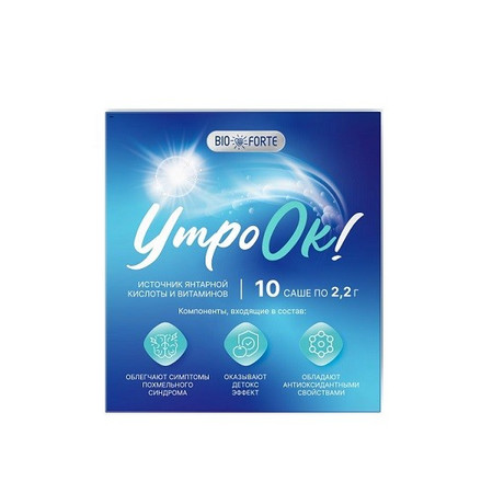 Витамин B3, ниацин, купирует тягу к спиртному, поддерживает работу центральной нервной системы, влияет на память и координацию движений.Способ применения УтроОК BioForte антипохмельный комплекс, саше 2,2 г, 10 шт. содержимое 1 саше-пакета (2,2 г) развести в 200-300 мл кипячёной воды комнатной температуры. Принимать взрослым 1 раз в день.