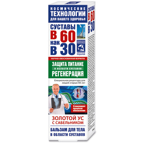 Действие и эффективность бальзама для тела В 60 как в 30. Золотой ус с сабельником обеспечены высокой биологической активностью и синергизмом его компонентов. Золотой ус (Callisia Fragronce) -одно из самых сильных лекарственных растений, мощный биогенный стимулятор с широким спектром лечебного действия. Благодаря редкому сочетанию биологически активных веществ, Золотой ус помогает при множестве заболеваний; особенно эффективен при лечении болезней суставов и позвоночника: ревматизма, артрита, артроза, радикулита, остеохондроза. Обладает выраженным обезболивающим, противовоспалительным, противомикробным, антисептическим, иммунорегулирующим, восстанавливающим действием, благотворно влияет на систему кровообращения. Высокая лечебная эффективность этого лекарственного растения принесла ему заслуженную любовь и доверие народа.