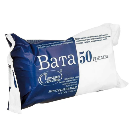 Вата нестерильная 50г. Вата медицинская гигроскопическая хирургическая хлопковая нестерильная изготавливается из 100% хлопка. Отбеливается без применения хлора, не содержит синтетики, посторонних примесей. Не вызывает аллергических реакций.