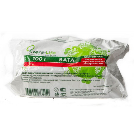 Вата медицинская гигроскопическая хирургическая стерильная Evers Life изготовлена из 100% хлопковых волокон, без посторонних примесей, в соответствии с ГОСТ 5556-81. 100 грамм