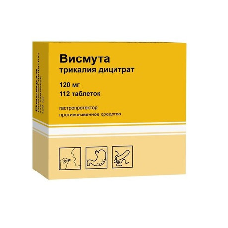 | Висмута трикалия дицитрат | Таб., покр. пленочной оболочкой, 120 мг: 7, 10, 14, 20, 21, 28, 30, 35, 40, 42, 49, 50, 56, 60, 70, 80, 84, 90, 98, 100, 112, 120, 140, 150, 160, 168, 180, 196, 210, 224, 240, 280, 300 или 480 шт. рег. №: ЛП-004537 от 13.11.17 *- Действующее* |