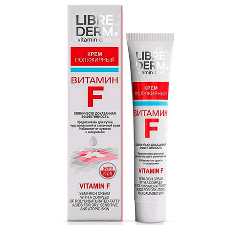 При недостатке Витамина F развивается сухость кожного покрова, появляется шелушение, раздражение, зуд.Витамин F (комплекс полиненасыщенных жирных кислот) эффективен при кожных раздражениях различного происхождения: шелушении, покраснении, трещинах, сухости. Ускоряет эпителизацию (заживление), оказывает мощное бактерицидное и антивоспалительное действие. Повышает защитные свойства кожи к воздействию неблагоприятных факторов внешней среды. Предотвращает увядание и старение кожи.Масло персика — дополнительный источник ПНЖК, витаминов и минеральных веществ. Прекрасно впитывается и обеспечивает быстрое проникновение в кожу активных компонентов крема. Масло насыщает кожу витаминами, смягчает и увлажняет кожу. Обладает восстанавливающими свойствами, уменьшает зуд, успокаивает кожу.Горофиты (высококонцентрированные экстракты) календулы и тысячелистника — усиливают противовоспалительное, заживляющее и антибактериальное действие крема. Способствуют гидратации кожи (насыщению эпидермиса влагой), оказывают тонизирующее воздействие.Не содержит парабенов, синтетических отдушек и красителей.крем полужирный
