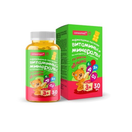 Аскорбиновая кислота (витамин С), лимонная кислота (регулятор кислотности), цинка цитрат, сок концетрированный яблочный, d-альфа токоферола ацетат (витамин Е), калия йодит, глазирователь (растительные масла, воск карнаубский), патока крахмальная, сахар, желатин, красители натуральные (колер сахарный, концентрированный сок черной моркови, экстракт картамуса, B-каротин), ароматизаторы натуральные (клубника, виноград, апельсин), пиридоксина гидрохлорид (витамин В6), холекальциферол (витамин D3), ретинола пальмитат (витамин А), цианокобаламин (витамин В12), фолиевая кислота, биотин, холина битартрат и инозит.