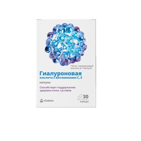 Гиалуроновая кислота способствует глубокому увлажнению кожи, улучшению упругости и тонуса. Регулирует регенеративные процессы в тканях, способствуя быстрому заживлению. Входит в состав синовиальной жидкости, заполняющей полость суставов и обеспечивающей внутрисуставную смазку. Улучшает микроциркуляцию крови, стимулируя появление новых капилляров. Принимает участие в антиоксидантной защите организма и т.д. Витамин С участвует в синтезе коллагена и способствует его сохранению в организме, помогает лучшему усвоению. Повышает барьерную функцию кожи, улучшает цвет лица. Обладает антиоксидантной активностью, нейтрализует свободные радикалы и замедляет процесс фотостарения. Витамин Е является универсальным протектором клеточных мембран от окислительного повреждения. Важен для регенерации тканей, уменьшает вероятность возникновения шрамов после травм. Способствует замедлению старения, повышает упругость кожи.В 1 капсуле содержатся: гиалуроновая кислота 150 мг, витамин С 14 мг, витамин Е 2,5 мг.
