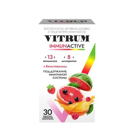 Витаминно-минеральный комплекс Витрум Иммунактив содержит 13 витаминов и 8 минералов, а также бета-глюканы и биофлавоноидный комплекс - необходимые компоненты, которые синергично работают для поддержки иммунитета.