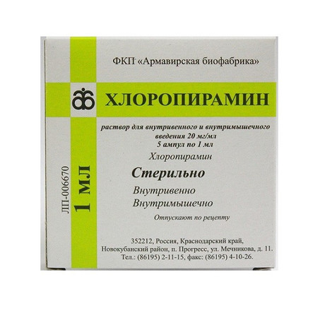 | Хлоропирамин | Р-р д/в/в и в/м введения 20 мг/мл: амп. 5 или 10 шт. рег. №: ЛП-006670 от 23.12.20 *- Действующее* |