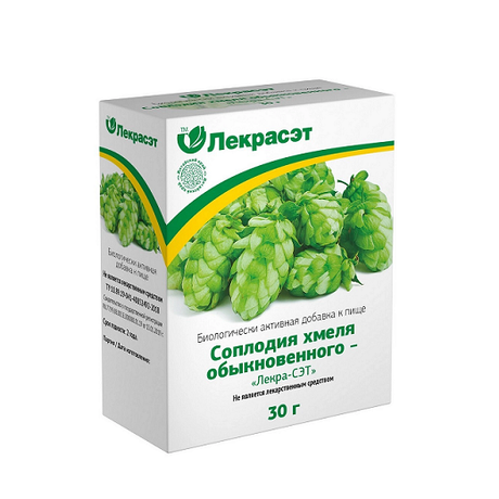 Хмель обыкновенный, или Хмель вьющийся (лат. Humulus lupulus) - вид травянистых многолетних растений рода Хмель (Humulus) семейства Коноплёвые (Cannabaceae). В соплодиях хмеля содержится эфирное масло , хмелевые смолы, воск, камедь, горькие вещества, валериановая, n-аминобензойная и хмелевая кислоты, гликозид лупулин, каротин, аскорбиновая кислота, холин, тиамин, никотиновая кислота, жёлтое красящее вещество, дубильные вещества, флавоноиды. Молодые побеги и листья содержат аскорбиновую кислоту. В качестве лекарственного сырья используют соплодия хмеля обыкновенного (лат. Strobilus Lupuli) или женские «шишки» хмеля обыкновенного (Amenta Lupuli). Соплодия с плодоножками собирают в июле - августе, когда они имеют желтовато-зелёный цвет. Используется как БАД для поддержания функции и снижения риска обострений воспалительных заболеваний мочеполовой системы .