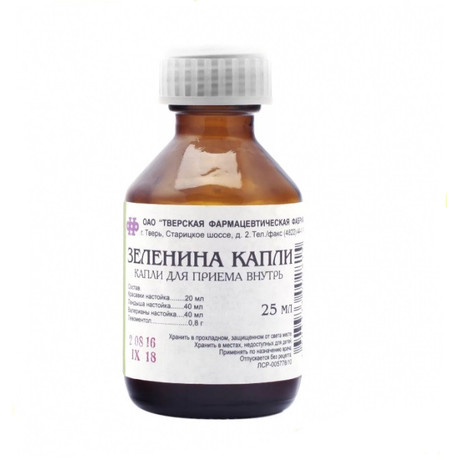 | Зеленина капли | Капли д/приема внутрь: фл. 25 мл, 30 мл или 40 мл; фл.-капельн. 20 мл, 25 мл или 30 мл рег. №: ЛСР-005778/10 от 23.06.10 *- Бессрочно* Дата перерегистрации: 19.10.18 |