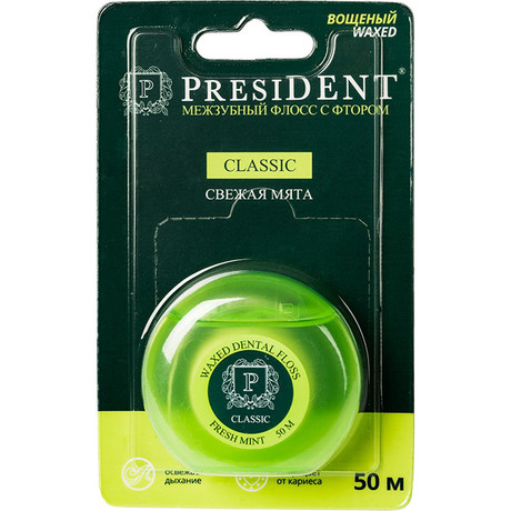 ПРЕЗИДЕНТ МЕЖЗУБНЫЙ ФЛОСС CLASSIC МЯТА ФТОР ВОЩЁНЫЙ - артикул 200 Внешний вид и свойства: Цвет - белый Вкус - Мятный Длина: 50 метров Для очищение межзубных промежутков. Ежедневная защита от кариеса и воспаления десен. Вощеный, универсальный флосс. Подходит для любых межзубных промежутков. Хорошо освежает. Фториды оказывают дополнительную профилактику кариеса. Фтор - профилактика кариеса Мята - свежее дыхание Воск - гладкое скольжение Удаляет остатки пищи и налет между зубами, надолго дарит ощущение свежести во рту, подходит для любых межзубных промежутков.