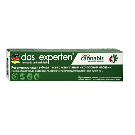Регенерирующая зубная паста Das Experten" Cococannabis не только нормализует воспаление десен, но еще и эффективна против бактерий, образующих зубной налет, более того, она является безопасной альтернативой синтетическим аналогам, так как не вызывает привыкании. Помимо этого, паста помогает от кариеса и неприятного запаха изо рта путем снижения уровня стрептококков и стафилококков в полости рта.